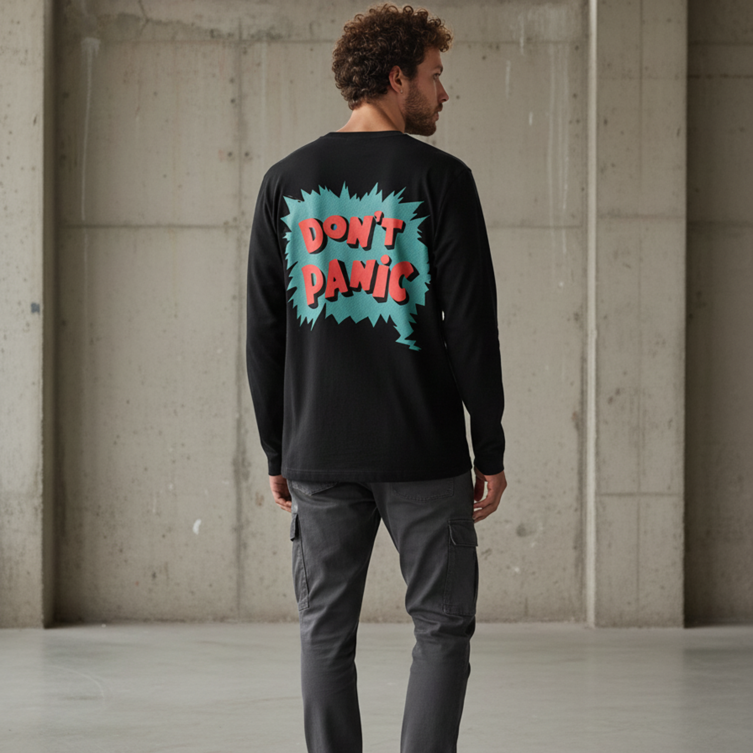 Keep calm and carry on with our "DON'T PANIC" Retro Pop Long Sleeve Tee! This bold black long-sleeve shirt features a vibrant, eye-catching graphic on the back that delivers a timeless message in an unforgettable style. The "DON'T PANIC" text, rendered in a striking red with a cool blue burst outline, instantly evokes a classic, comic-book-inspired aesthetic that's both fun and empowering.