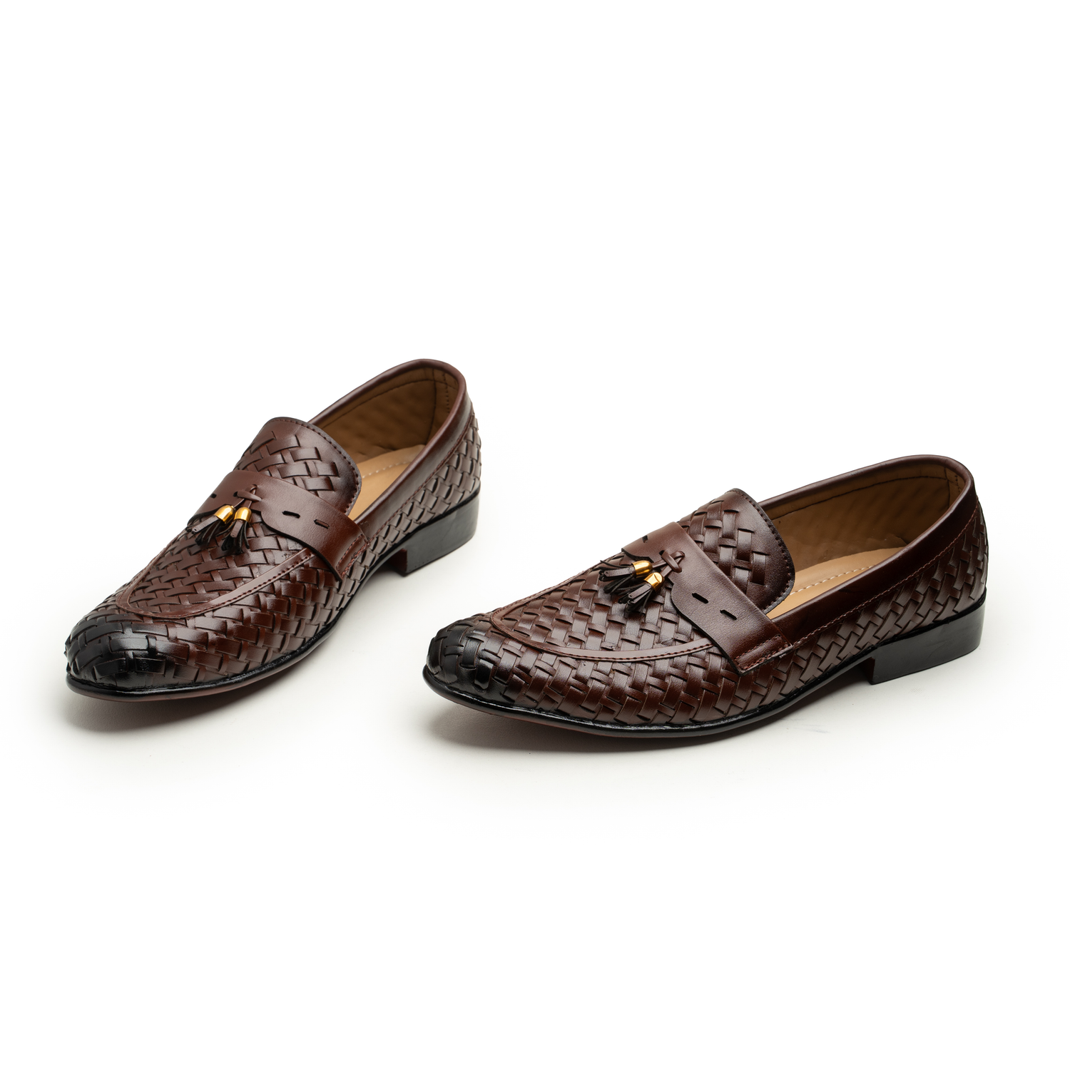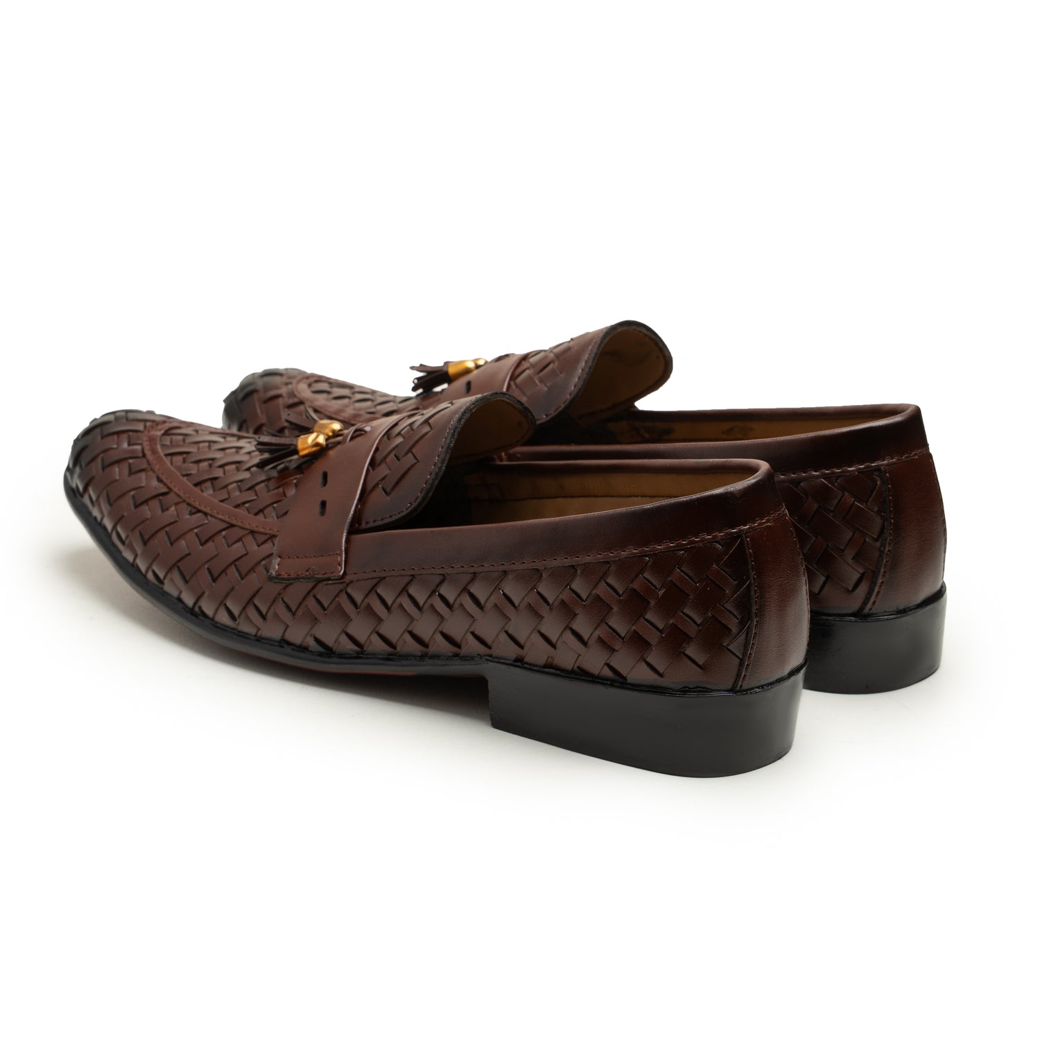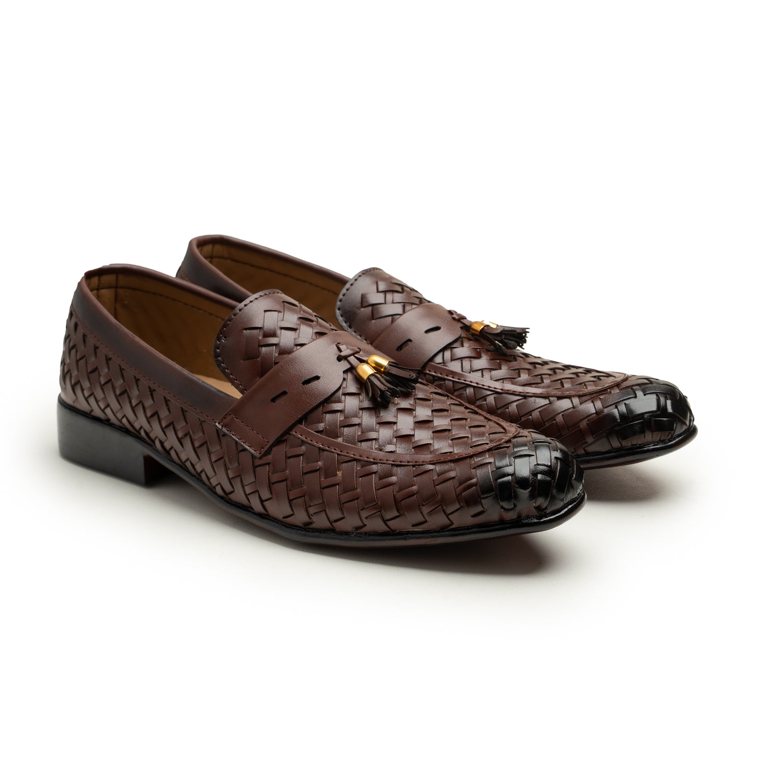 Introducing The Badshah, a shoe that embodies power and elegance. Meticulously handcrafted and hand-woven by WAX DNM, this loafer is a masterpiece of sophisticated design. The rich brown faux leather is intricately woven across the body of the shoe, creating a texture that is both visually stunning and a testament to its premium quality.