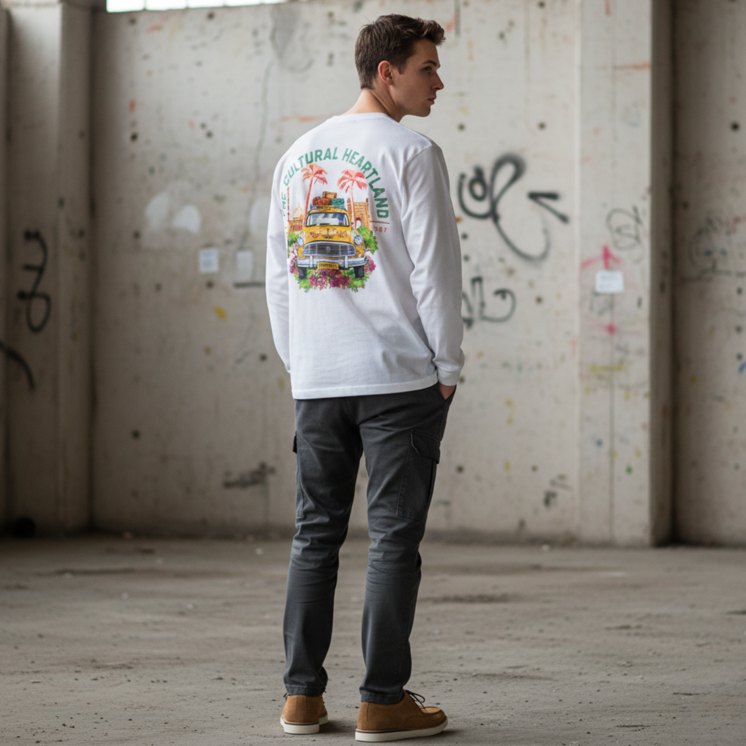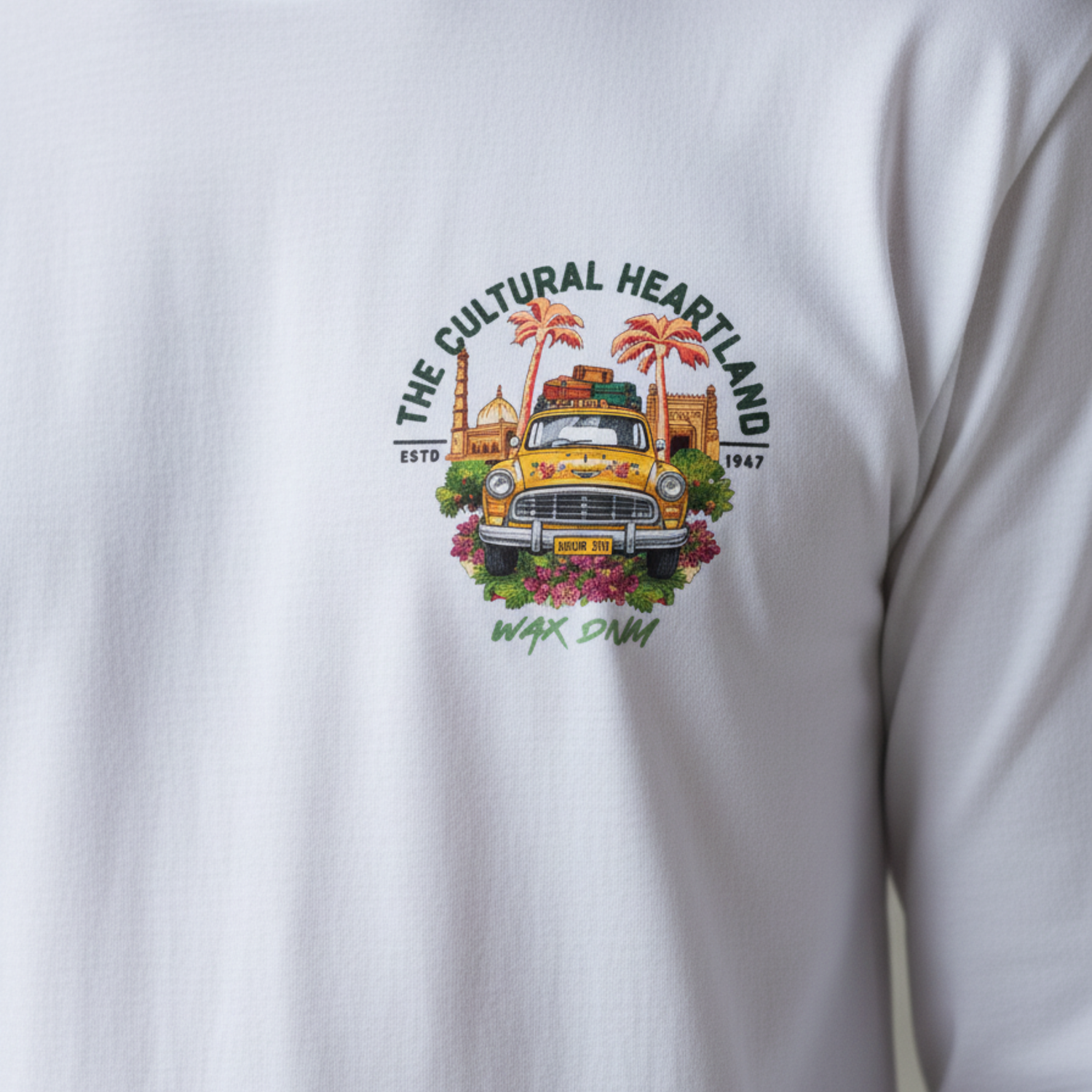Vibrant Back Graphic: Detailed, colorful print of a vintage van and tropical scene, bringing a piece of the "Cultural Heartland" to your style.