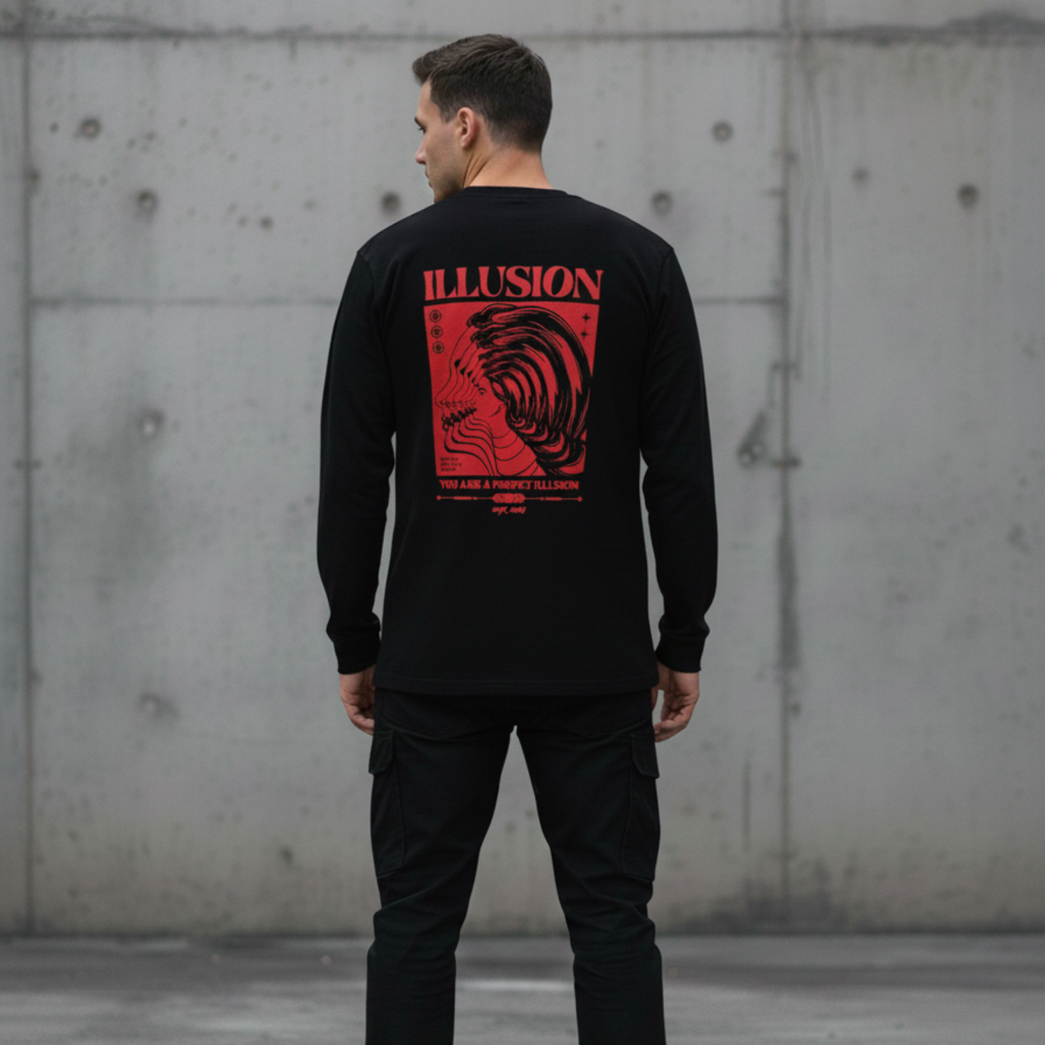 Unleash your enigmatic side with our "ILLUSION" Graphic Long Sleeve Tee. Crafted for those who appreciate a blend of modern style and profound statement, this black long-sleeve shirt features a striking red graphic that commands attention.
