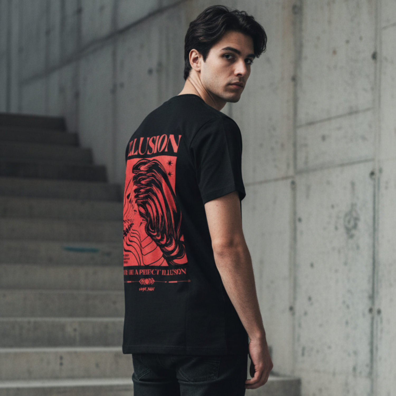 Bold Graphic Design: Eye-catching red "ILLUSION" print with a unique visual on the back.