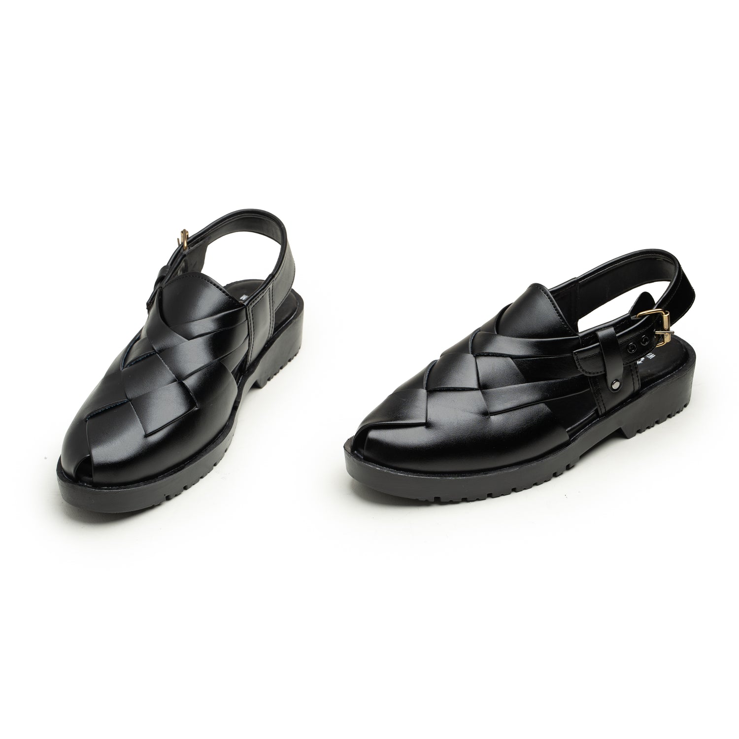 Constructed from high-quality smooth faux leather, the upper features a structured woven strap design that offers both breathability and visual depth. The adjustable ankle strap with metal buckle ensures a secure, customized fit while adding a refined edge to the overall profile.