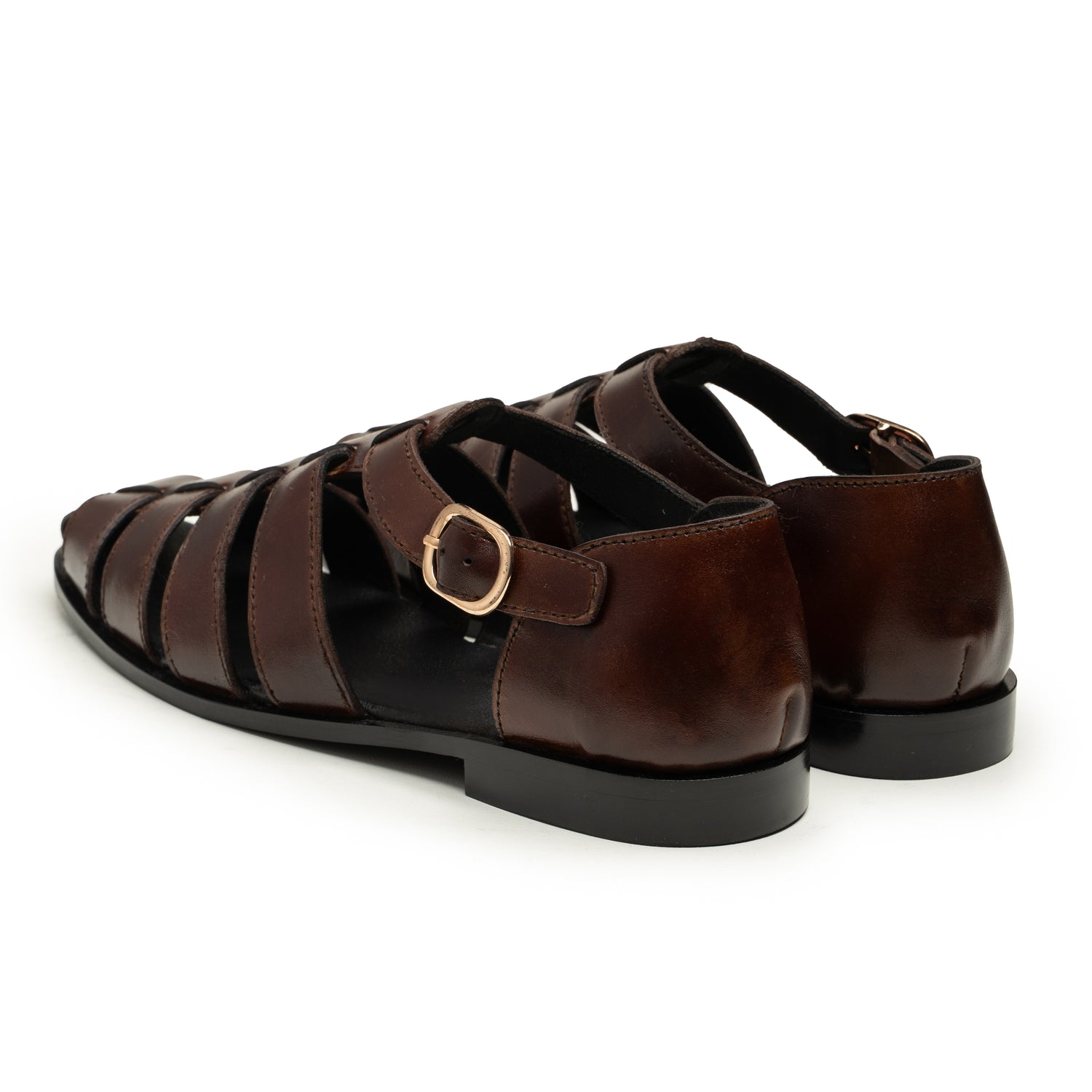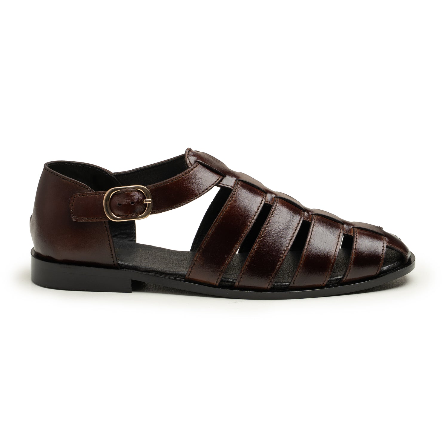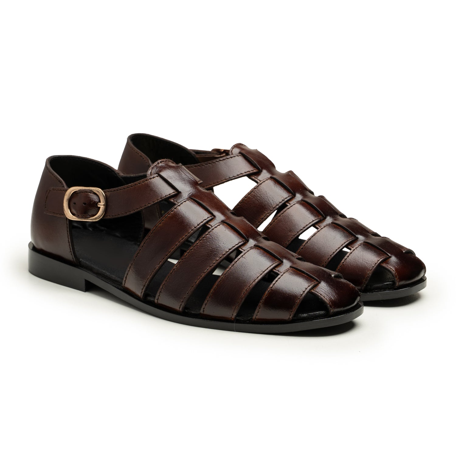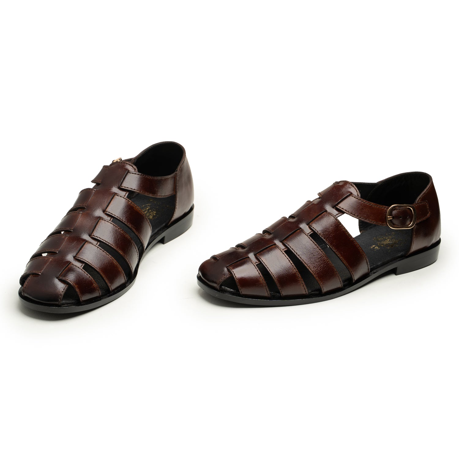 Inspired by classic gladiator and fisherman sandal styles, the "Viking Brown" features an intricate woven strap design that provides ample coverage and support while allowing for breathability. A secure, adjustable gold-tone buckle at the ankle ensures a perfect, comfortable fit. The robust construction and classic flat sole promise enduring style and comfort for all-day wear.